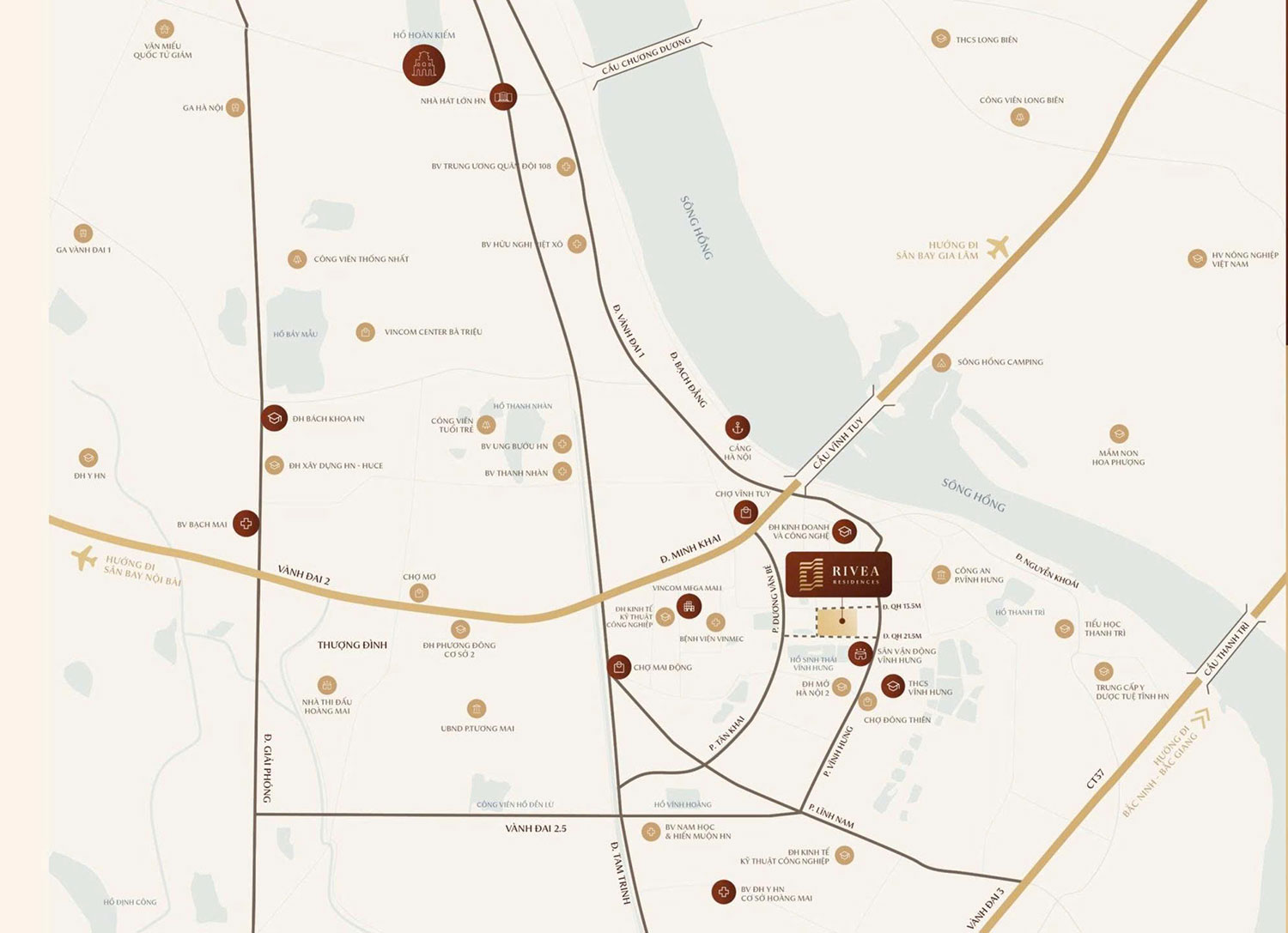 Dự án Rivea Hanoi tọa lạc tại phường Vĩnh Hưng, quận Hoàng Mai – một trong những khu vực được đánh giá “cửa ngõ phía Nam” của Hà Nội. Khu vực này sở hữu hệ thống giao thông kết nối đa chiều: gần trục đường vành đai 2.5, cầu Vĩnh Tuy và các tuyến metro đang triển khai – tất cả tạo nền tảng cho khả năng tăng giá bất động sản trong tương lai.